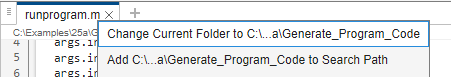 In the MATLAB workspace, go to the directory where you saved runprogram.m. One way is to right-click the file name in the MATLAB Editor and select Change Current Folder to.