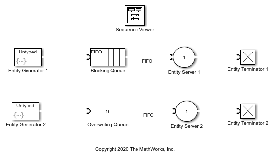 Simulate the model and open the Sequence Viewer block. Observe that the Entity Generator 1 and Entity Generator 2 blocks initially generate entities with data values of 0.8147, and the entities are forwarded to Entity Server 1 and Entity Server 2. Both Entity Generator blocks generate a second set of entities with data values of 0.9058, which are stored in the Blocking Queue and Overwriting Queue because both Entity Server blocks are full. The rest of the generated entities are also stored in the Entity Queue blocks.