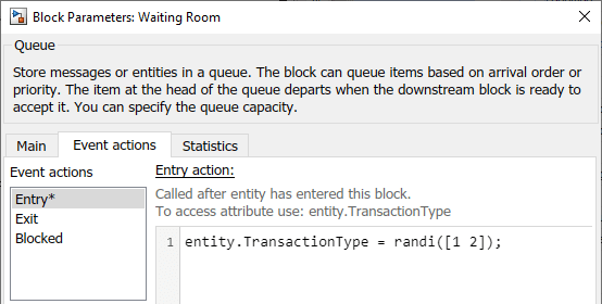 You can attach attributes to entities to represent their features. In a queueing system, you can use actions as responses to events and change entity attributes. For instance, you can change the value of an entity attribute when the entity enters and exits the Entity Queue block. In the Entity Queue block, in the Event actions tab, you can see the set of events for which you can create actions.
