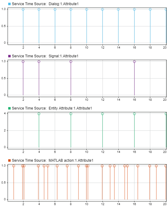 Dialog— You can define a constant service time value. In the first modeling pattern, entities are delayed for2seconds. The block then attempts to forward entities to the next block.Signal port— An incoming Simulink® signal determines the service time. In the second modeling pattern, the block uses ramp signal values as the service time source.Attribute— A specified entity attribute value determines the service time. In the third modeling pattern, each entity carriesAttribute1with value4which is the service time source.