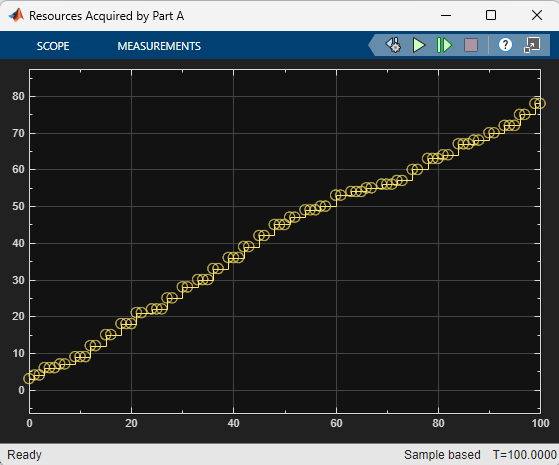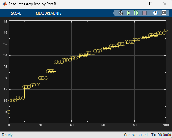 Simulate the model. Observe the Scope block connected to the Data Store Read Part A. The scope shows that Part A acquires 30 resources around the simulation time 40.