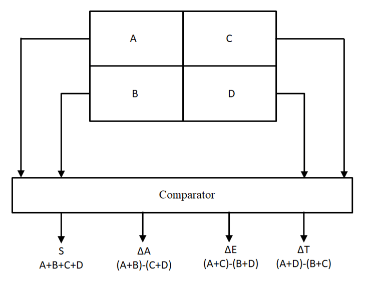 Different types of antennas are used to implement the monopulse technique and the diagram shows that the power received from the four quadrants of antenna is given to the passive comparator network to obtain sum (S), azimuth difference (AD), elevation difference (ED), and a cross-quadrant difference (CQD) , all calculated using the following equations.