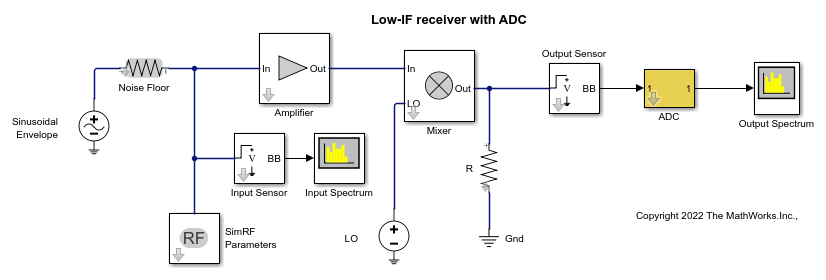 The model ex_simrf_adc_rx simulates a low IF receiver with an ADC. This model is based on low IF receiver design from the Model System Noise Figure. At the output of the RF system, the ADC subsystem models an ADC with an FS range of sqrt(100e-3) V and a resolution of 16 bits.