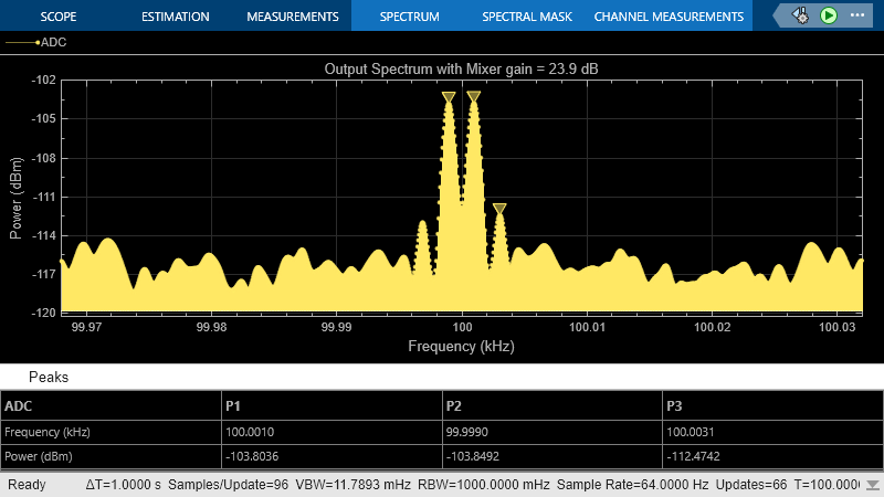 The Spectrum Analyzer Block shows the power spectrum of the two-tone signal and noise at the input of the receiver-ADC system. The measured power of each tone of -142 dBm is consistent with the expected power level of a 0.1 uV signal. The power level of the noise is consistent with a -174 dBm/Hz noise floor. The output spectrum plot shows power spectrum of the output signal.