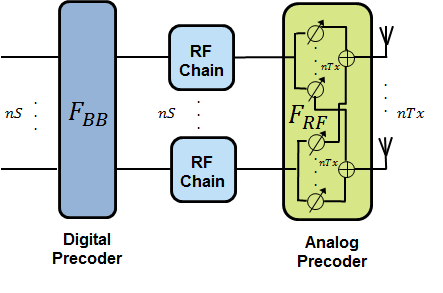 Compared to current wireless systems, the wavelength in the mmWave band is much smaller. Although this allows an array to contain more elements within the same physical dimension, it becomes much more expensive to provide one transmit-receive (TR) module, or an RF chain, for each antenna element. Hybrid transceivers are a practical solution as they use a combination of analog beamformers in the RF and digital beamformers in the baseband domains, with fewer RF chains than the number of transmit elements [1].