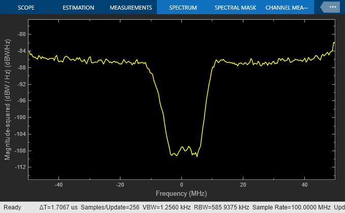 The Spectrum Scope block displays the frequency response at the shifted (baseband-equivalent) frequencies, not at the selected passband frequencies. You can relabel the x-axis of the Spectrum Scope window to display the passband signal by entering the Center frequency parameter value of 400e6 (from the Input Port block) for the Frequency display offset (Hz) parameter in the Axis Properties tab of the Spectrum Scope block. For more information on complex-baseband modeling, see Create Complex Baseband-Equivalent Model.
