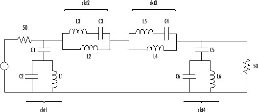 Type the following at the MATLAB prompt to create RF circuit objects that model the components labeled ckt1, ckt2, ckt3, and ckt4 in the circuit diagram:
