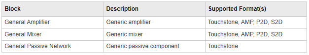 Agilent® P2D file format — Specifies amplifier and mixer large-signal, power-dependent network parameters, noise data, and intermodulation tables for several operating conditions, such as temperature and bias values. The P2D file format lets you import system-level verification models of amplifiers and mixers.