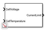 The Battery Discharging Current Limit block calculates the maximum discharging current of a battery. Limiting the charging and discharging currents is an important consideration when you model battery packs.