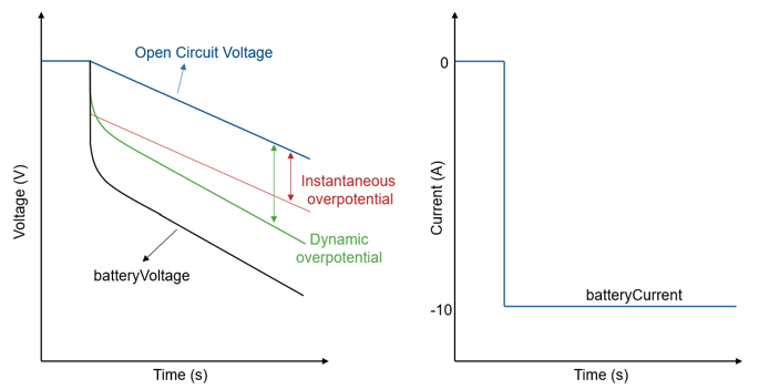 For the Battery Equivalent Circuit block, I has a negative sign during discharge and a positive sign during charge. During discharge, the block subtracts the battery overpotentials from the open-circuit voltage value, lowering the terminal voltage of the battery. In the discharge and charge cases, the overpotentials dissipate energy as heat. This figure shows the evolution of the battery overpotentials during a battery pulse discharge. The dynamic overpotential from the resistor-capacitor pairs increases slowly over the pulse, as opposed to the instantaneous overpotential, which increases during the first few milliseconds.