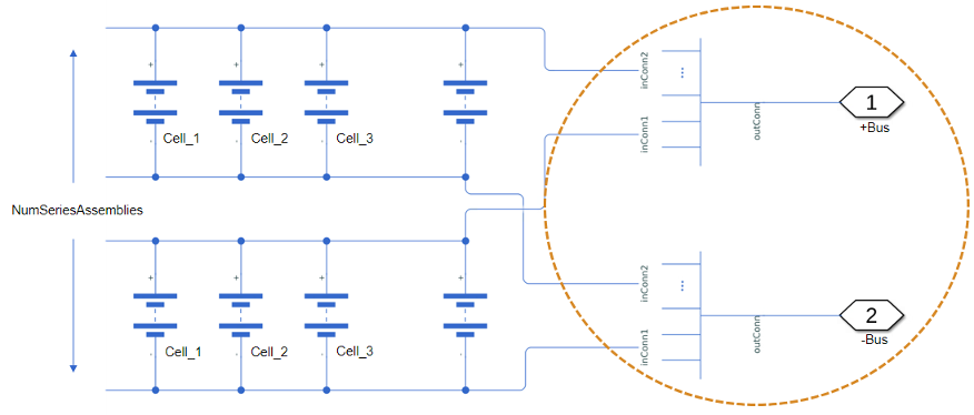 Use Module to create a battery module object that represents a number of battery parallel assemblies connected electrically in series. You can use this object as an input to the ModuleAssembly object to create larger battery models.