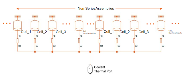 Inside a battery object, you can set up a thermal network of lumped-thermal-mass cell models to simultaneously capture the thermal paths to the ambient, the coolant, and/or the cooling plate: