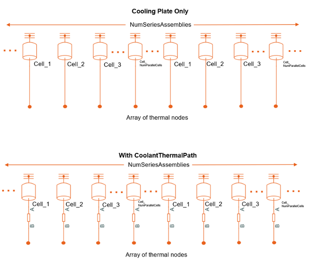 These options are not mutually exclusive. For example, your battery model can combine both the coolant thermal path and the cooling thermal plates to model individual thermal resistances between the individual cells and the sections of the cooling plate.