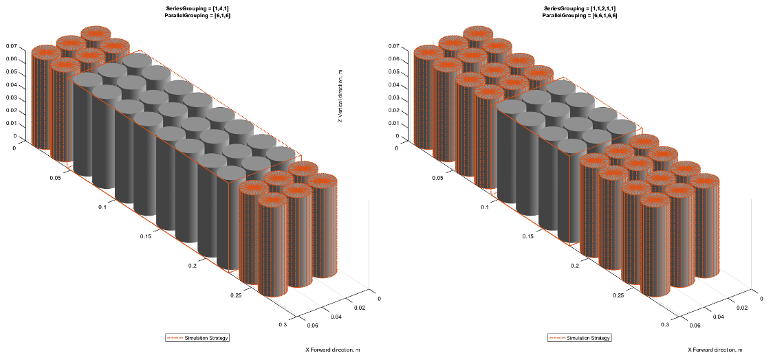 For the submodules with a single parallel assembly, you can further discretize the electrical and thermal models to obtain the resolution for each cell by setting the ParallelGrouping property to [6 1 6] and [6 6 1 6 6], respectively.