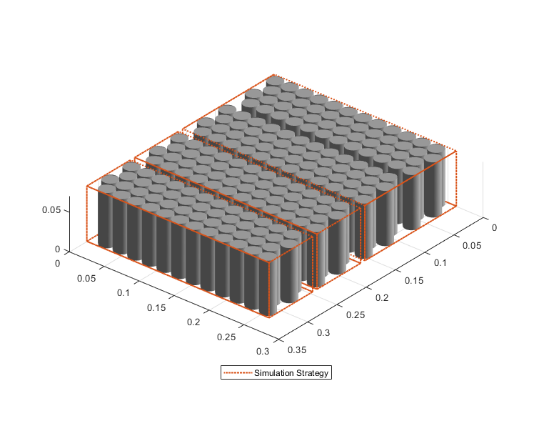 For modules with hexagonal cylindrical cells, you can also enable the heat transfer between the cells of the module and a serpentine cooling plate. To expose the thermal nodes at a serpentine cooling plate inside the module, specify the SerpentineCoolingPlate property. You can then further define the fraction of the circumference and height of the cylindrical cells used as heat exchange interface in serpentine cooling plates by specifying the FractionOfCellCircumferenceForHeatExchange and FractionOfCellHeightForHeatExchange properties.