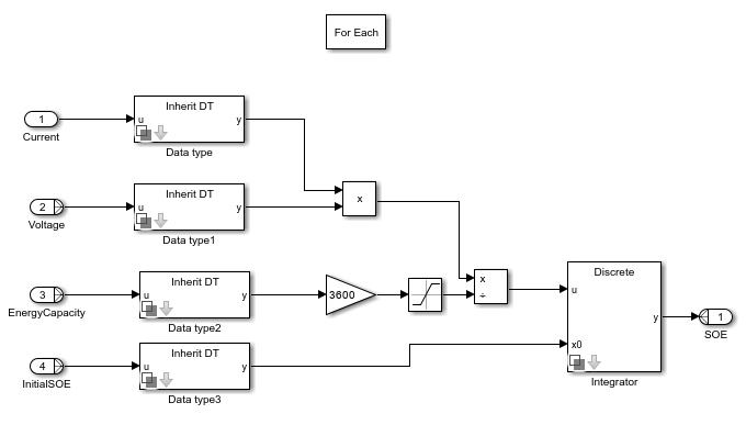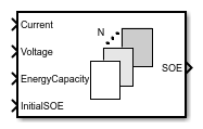 The SOE Estimator (Energy Counting, Variable Capacity) block implements an estimator that calculates the state of energy (SOE) of a battery by using the energy counting method. The cell energy capacity of the battery is an input to the block.