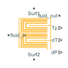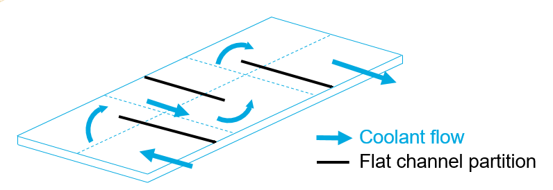 Typically, a cooling plate comprises two stamped flat plates joined together. The stamped portion of the plate forms a channel in which the fluid can flow. The U-shaped Channels block models the flat material of the plate by using one or more Thermal Mass blocks and the fluid-flow through the cooling channels by using Pipe (TL) blocks. The number of Pipe (TL) blocks and their connection to the plate depend on the discretization. For more information on the implementation of the Pipe (TL) block and its equations, see the Pipe (TL) documentation page.