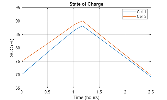 This example shows how to balance a battery with two cells connected in series by using the switched-capacitor (SC) strategy for active cell balancing. For shuttling the energy between the battery cells, this method uses capacitors as external energy storage elements. To balance N cells, the SC method requires N-1 capacitors and 2*N bidirectional switches. The control strategy has two states only and can work in charging and discharging modes. The initial state of charge (SOC) is 0.7 for one cell and 0.75 for the other. To generate more detailed battery packs, use the objects and functions in the Battery Pack Model Builder.