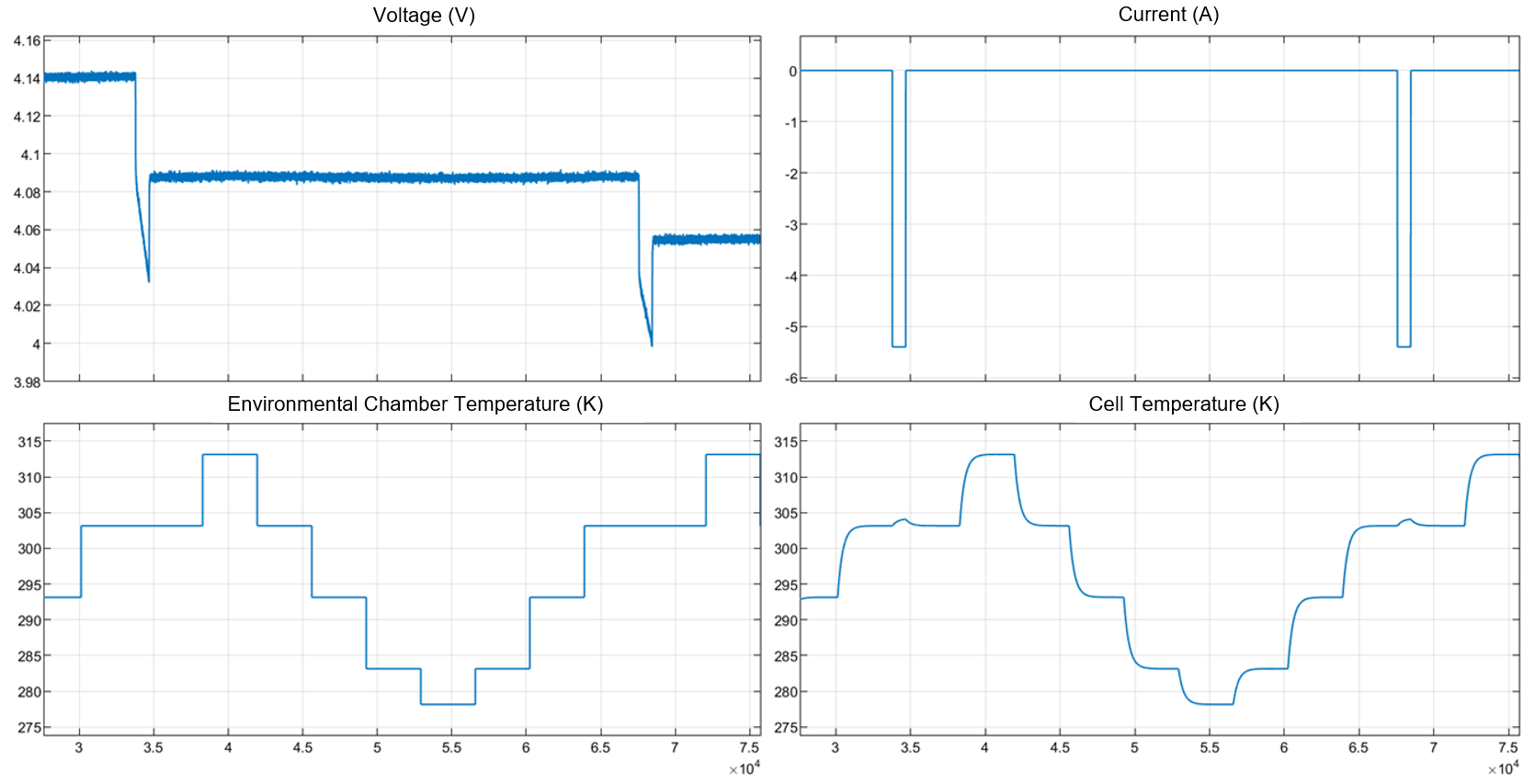 These figure show the test used to characterize the entropic heat coefficient. The figure on the left shows the measured battery terminal voltage. The figure on the right shows the measured input current.