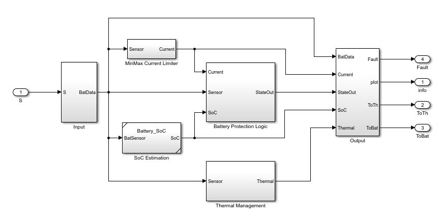 The BMS in this example comprises four different components: SoC estimation, MinMax Current Limiter, Thermal Management, and Battery Protection Logic.