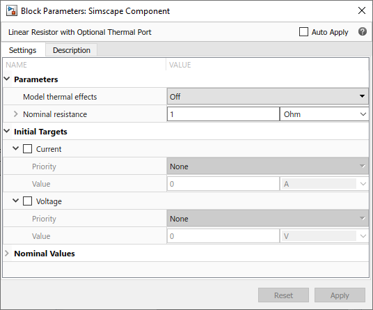 If the control parameter, Model thermal effects, is set to Off, the block represents a linear resistor. The only exposed block parameter is Nominal resistance, the Initial Targets section lets you set targets for Current and Voltage, and the block icon has two ports, + and -.