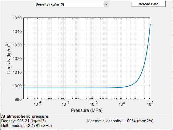 To plot the data, right-click the Isothermal Liquid Properties (IL) block in your model and, from the context menu, select Foundation Library > Plot Fluid Properties. Use the drop-down list located at the top of the plot to select the fluid property to visualize. Click the Reload button to regenerate a plot following a block parameter update.