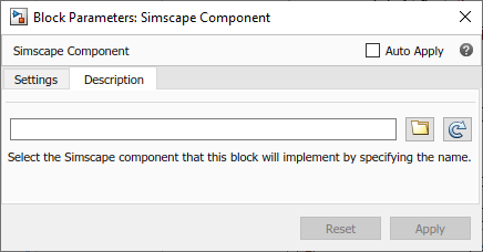 When a Simscape Component block points to a valid Simscape language component file, its dialog box has the name, description, parameters, and variables defined by that source file. The Description pane also has the source selector field that displays the name of the current source file and lets you point the block to a different component file.
