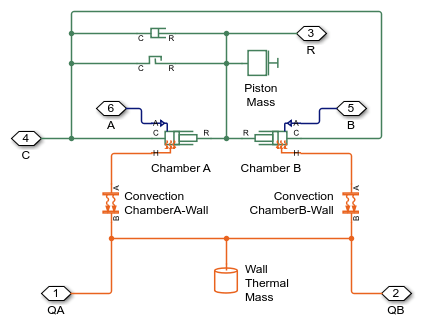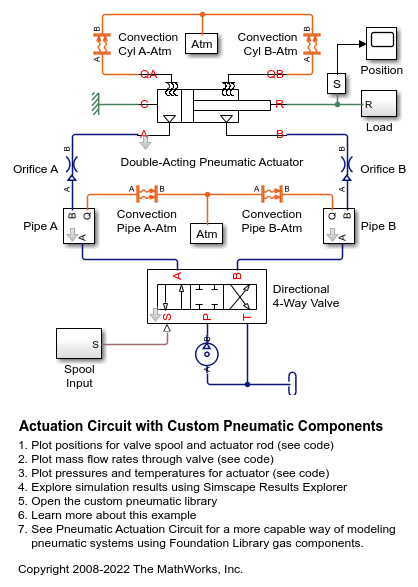 This example shows how to model a controlled actuator using simplified custom pneumatic components. There are two across variables, defined as pressure and temperature, and two through variables, defined as mass flow rate and heat flow rate. The simplified approach means that every node in the circuit must have a volume of gas associated with it. This physical volume of gas in the circuit is represented by the Constant Volume Pneumatic Chamber blocks, the Pneumatic Piston Chamber blocks, and the Pneumatic Atmospheric Reference block. Conversely, the Foundation Library gas components require no such connection rules at every node. See the Pneumatic Actuation Circuit example for a more capable way of modeling pneumatic systems using Foundation Library gas components.