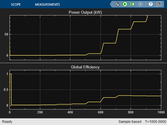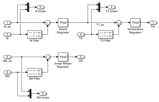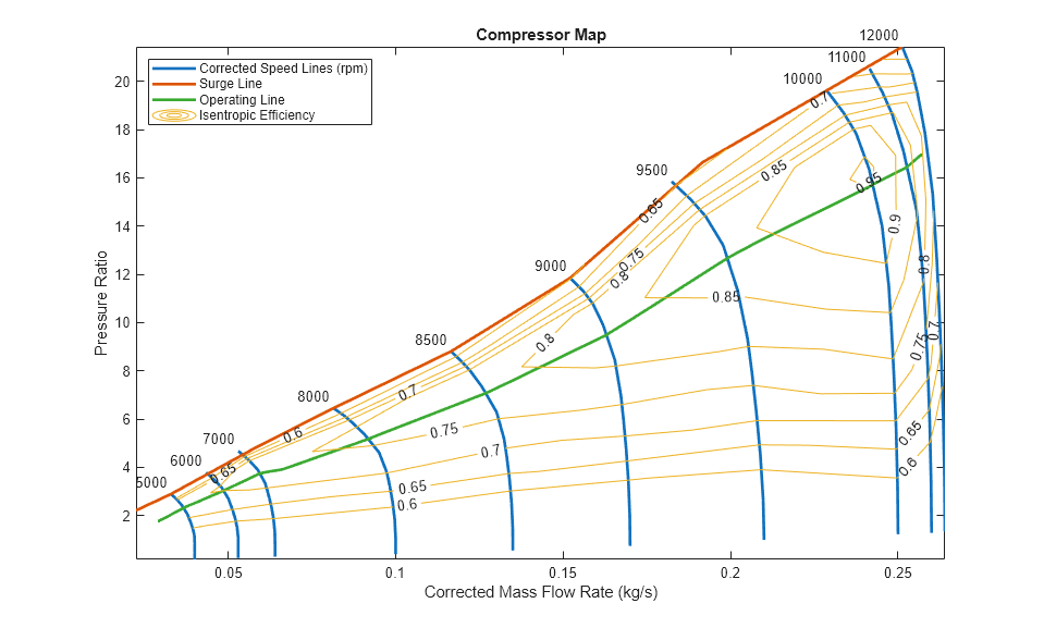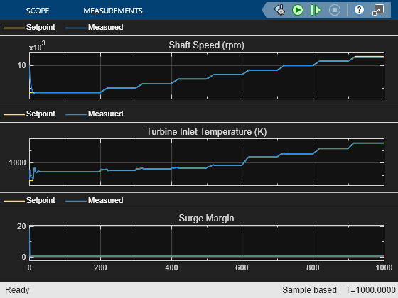 Three PID controllers regulate the shaft speed, the turbine inlet temperature, and the compressor surge margin. System inputs are defined for three scenarios: varying shaft speed, varying surge margin, and varying APU vane opening. Running the first scenario produces the typical operating line on the compressor map. Running the second and third scenarios show where the maximum power output and maximum global efficiency occurs.