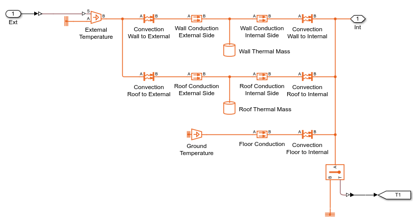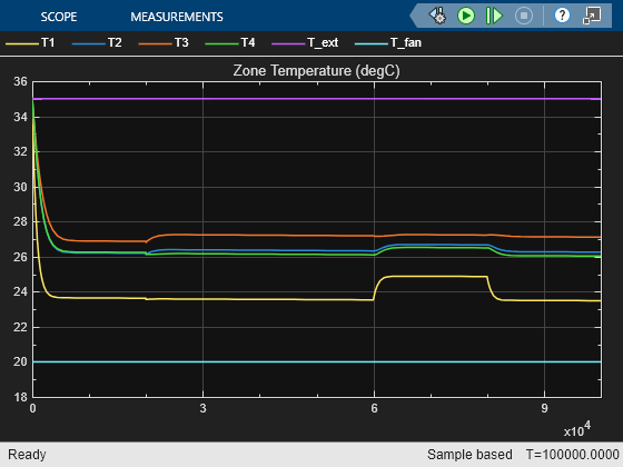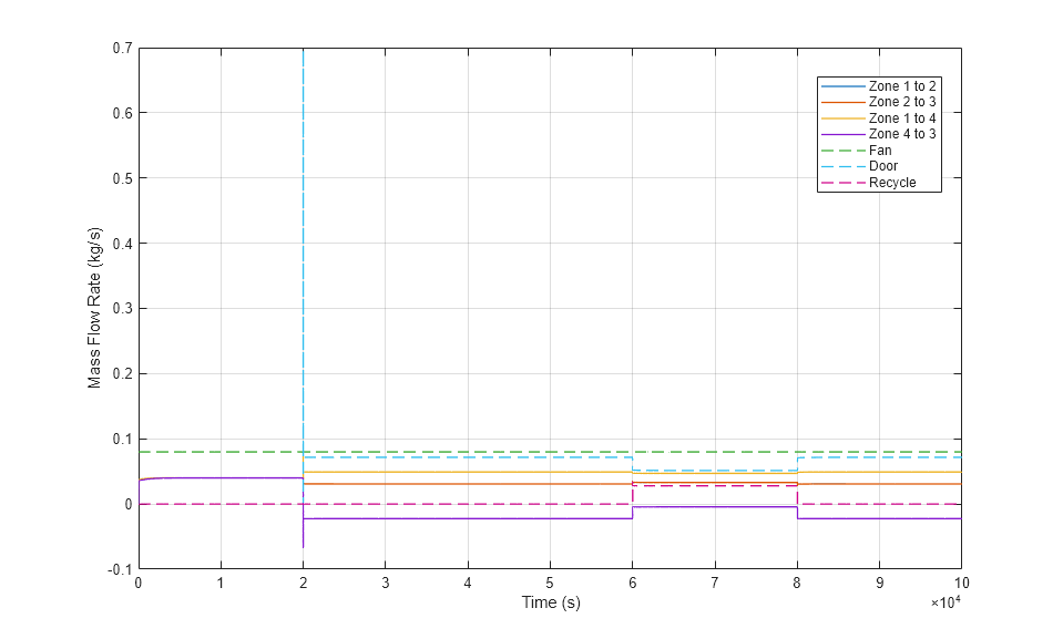 This example models a ventilation circuit in a building. The air volume inside the building is divided into four zones. The ventilation unit blows cool air into Zone 1 and extracts air from Zone 3. The extracted air can be optionally recycled back into Zone 1. A door in Zone 4 can be opened to vent air out to the atmosphere.