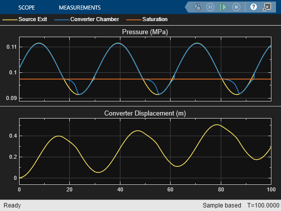 This example shows how two-phase fluid components can be used to simulate cavitation. The model is a translational mechanical converter driven by an oscillating pressure source. During the negative portion of the pressure source cycle, the fluid cavitates, reducing the force produced by the converter. As a result, the converter displacement drifts and does not return to the starting position.