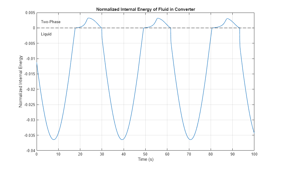 This plot shows the normalized internal energy (unorm) of the fluid volume in the Translational Mechanical Converter (2P). The phase of the fluid can be determined by inspecting this plot: the fluid is a