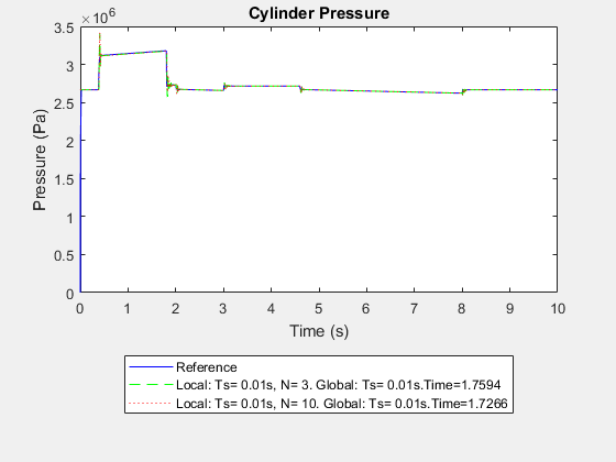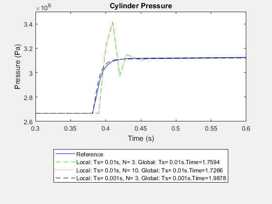 figure(h2) hold on plot(tSim2, pSim2, 'r:') delete(h2Legend2) axis([xStart xEnd yStart yEnd]) configSim2L = ['Local: Ts= ',num2str(ts),'s, N= ',num2str(N),'.']; configSim2G = [' Global: Ts= ',num2str(tsG),'s.']; timeSim2T = ['Time=',num2str(time2)]; cfgSim2 = [configSim2L,configSim2G,timeSim2T]; h2Legend3 = legend({'Reference',num2str(cfgSim1),num2str(cfgSim2)},... 'Location','southoutside');