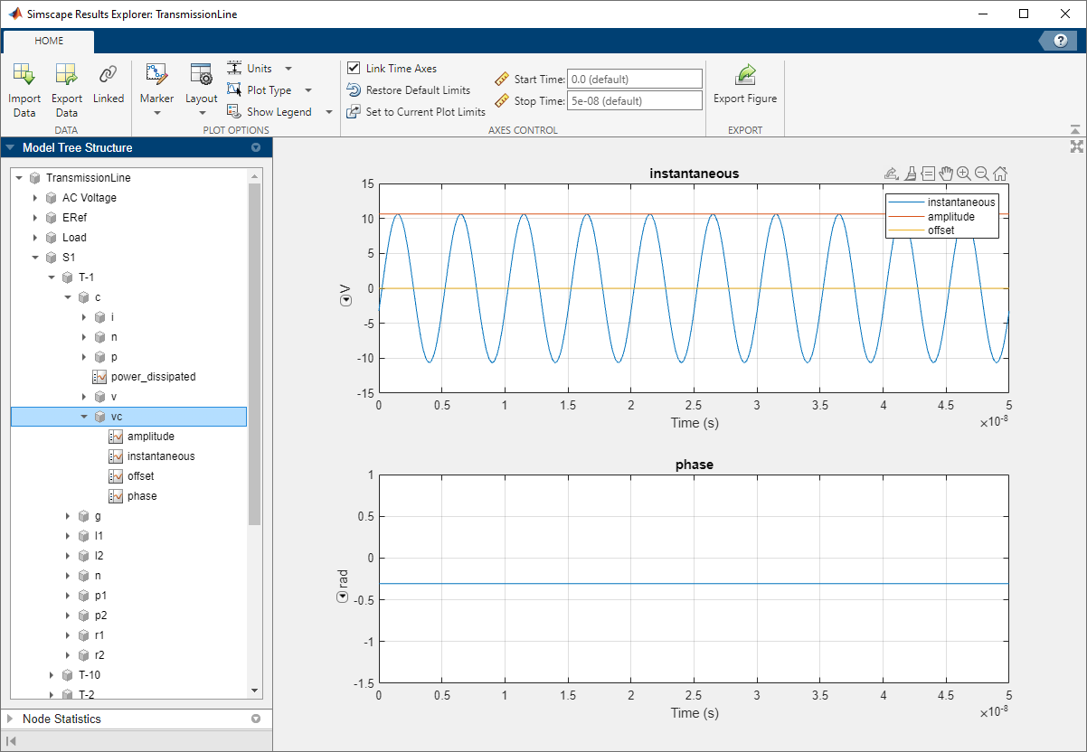 8. The logged simulation data for frequency variables contains subnodes that let you examine the variable instantaneous value, amplitude, phase, and offset data separately.