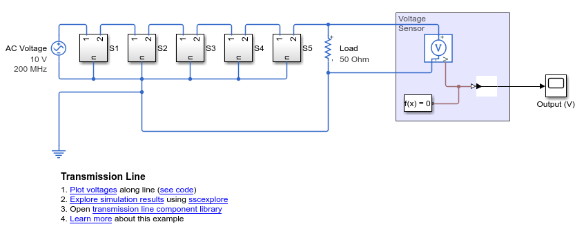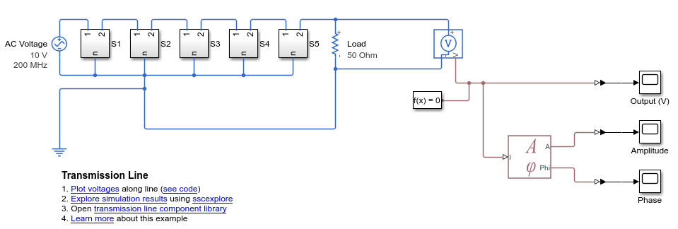 The transmission line model used in this example is built from 50 identical blocks, each block representing a single T-section segment. For more information, see Transmission Line. The model has one sinusoidal source (AC Voltage) and operates at a nominal frequency 200 MHz, which makes it a good candidate for frequency-and-time simulation.