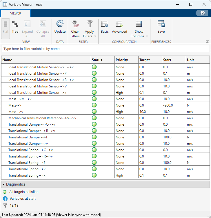 The rest of the variables in the model do not have initialization priority specified, therefore their Status column also displays green circles. The overall status at the bottom of the Variable Viewer window displays a green circle as well, and says that all the targets are satisfied.