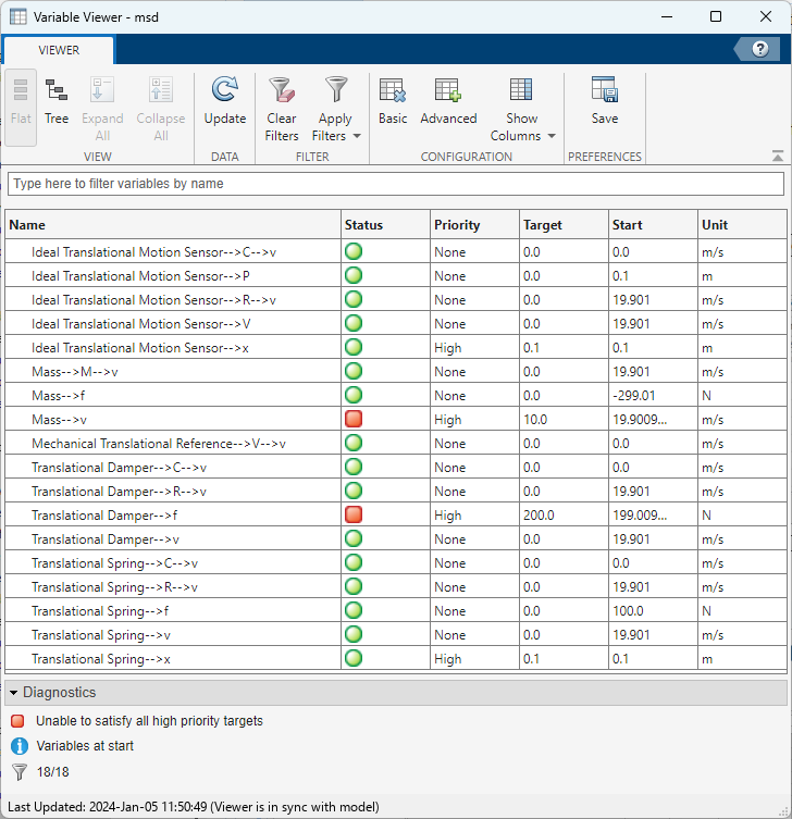 However, the Variable Viewer shows that the model initialization solution does not satisfy your target values for block variables. This happens because placing high-priority constraints on all three elements of the mass-spring-damper system results in a conflict. You can resolve the over-specification issue by relaxing the priority of some of the conflicting variable targets.