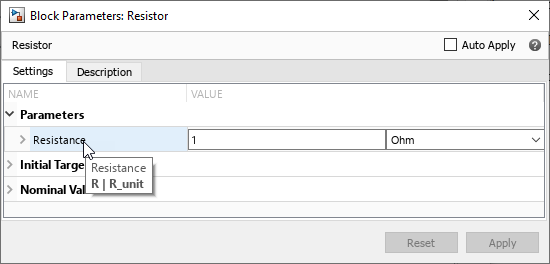 To use Dashboard blocks for run-to-run tuning of Simscape block parameters, designate the parameter as