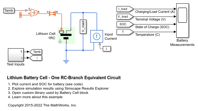 This example shows how to model a lithium cell using the Simscape™ language to implement the elements of an equivalent circuit model with one RC branch. For the defining equations and their validation, see T. Huria, M. Ceraolo, J. Gazzarri, R. Jackey. "High Fidelity Electrical Model with Thermal Dependence for Characterization and Simulation of High Power Lithium Battery Cells," IEEE International Electric Vehicle Conference, March 2012.