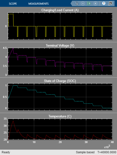 A simple thermal model is used to model battery temperature. It is assumed that cooling is primarily via convection, and that heating is primarily from internal resistance. A battery pack can be modeled by connecting multiple copies of the battery cell block in series.