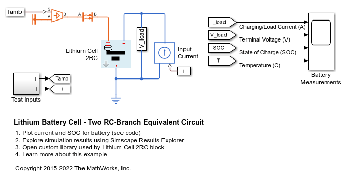 This example shows how to model a lithium cell using the Simscape™ language to implement the elements of an equivalent circuit model with two RC branches. For the defining equations and their validation, see T. Huria, M. Ceraolo, J. Gazzarri, R. Jackey. "High Fidelity Electrical Model with Thermal Dependence for Characterization and Simulation of High Power Lithium Battery Cells," IEEE International Electric Vehicle Conference, March 2012.
