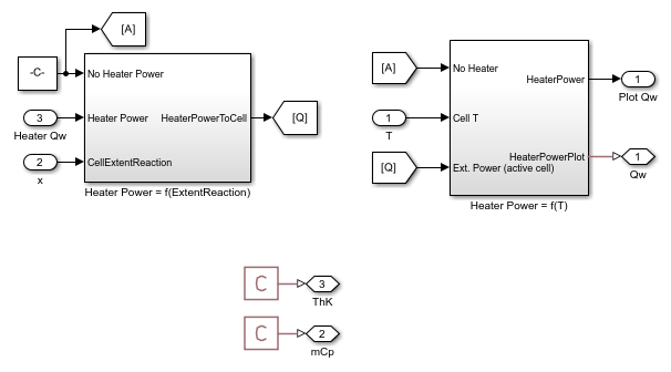 mCp - Thermal mass change of each cell, specified as a fraction greater than 0. To obtain the actual thermal mass of the cell, this value is multiplied to the cell thermal mass. The mCp port value models the changes in the cell thermal mass as the cell reacts. In this example, the mCp port value does not change with time or cell reaction.