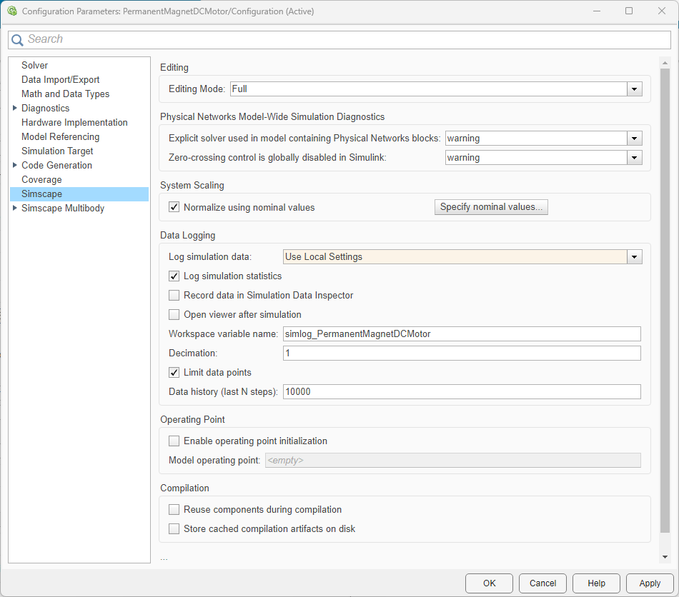 Open the Configuration Parameters dialog box and then, in the left pane, select Simscape. This example model has data logging for the whole model enabled. To enable data logging on a block-by-block basis, set the Log simulation data parameter to