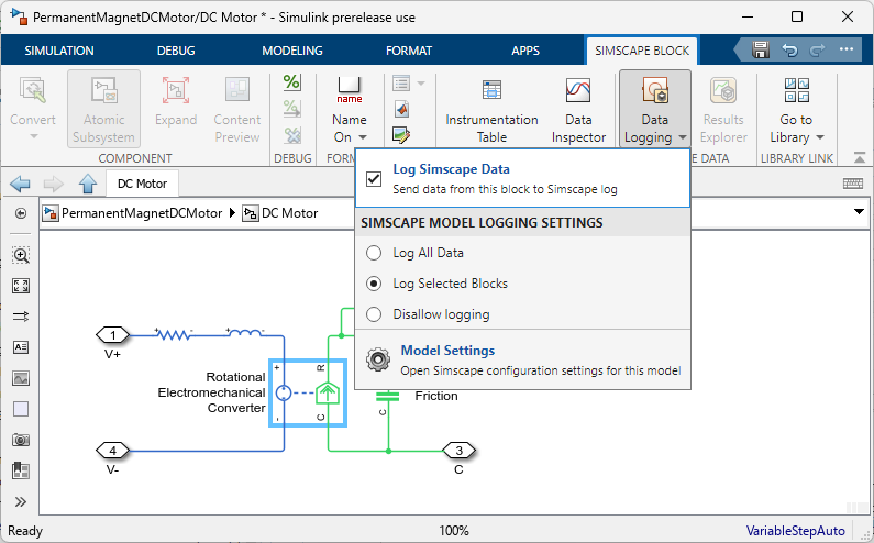 Select the blocks for data logging. Click the Rotational Electromechanical Converter block, and then, on the Simscape Block tab, click Data Logging and select the Log Simscape Data check box.