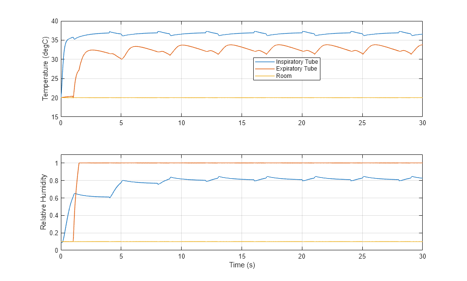 This plot shows the temperature and relative humidity of air flowing through the inspiratory and expiratory tubes. Room air is heated and humidified before it is supplied to the patient.