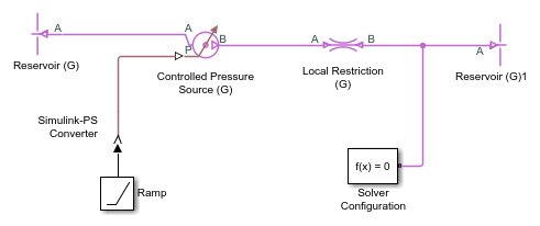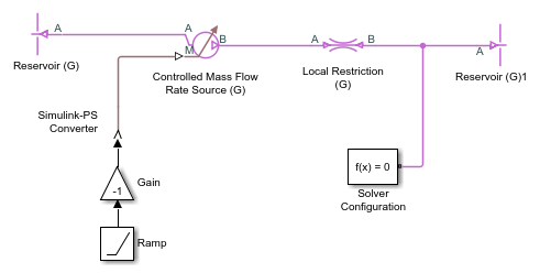 The fact that the choked mass flow rate depends only on the upstream conditions can cause an incompatibility with a Mass Flow Rate Source (G) or a Controlled Mass Flow Rate Source (G) connected downstream of the choked block. Consider the model shown in the next illustration, which contains the Controlled Mass Flow Rate Source (G) block instead of the Controlled Pressure Source (G).