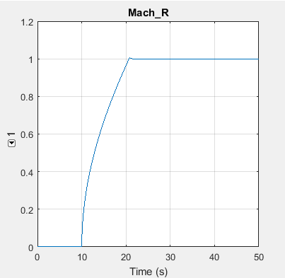 If the source commanded an increasing mass flow rate from left to right through the Local Restriction (G), the simulation would succeed even if the flow became choked because the Controlled Mass Flow Rate Source (G) would be upstream of the choked block. However, in this model the Gain block reverses the flow direction, so that the Controlled Mass Flow Rate Source (G) is downstream of the choked block. The pressure upstream of the Local Restriction (G) is fixed at atmospheric pressure. Therefore, the choked mass flow rate in this situation is constant. As the commanded mass flow rate increases, eventually it will become greater than this constant value of choked mass flow rate. At this point, the commanded mass flow rate and the choked mass flow rate cannot be reconciled and the simulation fails. Viewing the logged simulation data in the Simscape Results Explorer shows that simulation fails just at the point when the Mach number reaches 1 and the flow becomes choked.