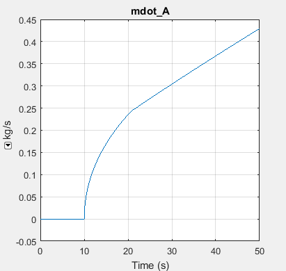 The following illustration shows the logged simulation data for the Local Restriction (G) block. The Mach number at the restriction (Mach_R) reaches 1 at around 20 s, indicating that the flow is choked. The mass flow rate (mdot_A) before the flow is choked follows the typical quadratic behavior with respect to an increasing pressure difference. However, the mass flow rate after the flow is choked becomes linear because the choked mass flow rate depends only on the upstream pressure and temperature, and the upstream pressure is increasing linearly.