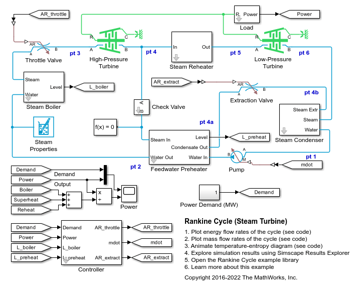 This example models a steam turbine system based on the Rankine Cycle. The cycle includes superheating and reheating to prevent condensation at the high-pressure turbine and the low-pressure turbine, respectively. The cycle also has regeneration by passing extracted steam through closed feedwater heaters to warm up the water and improve cycle efficiency.