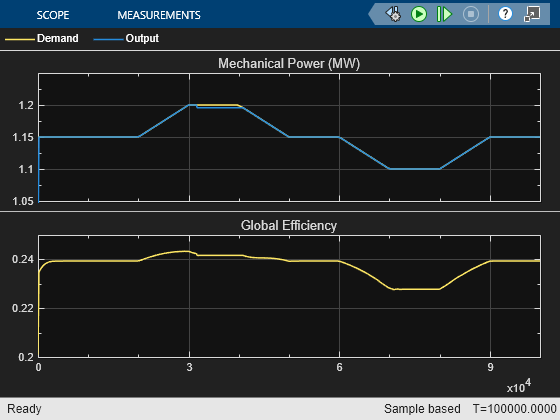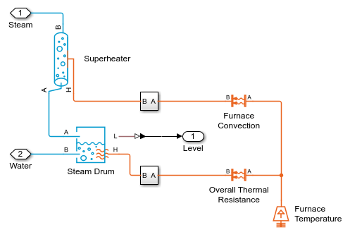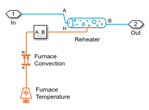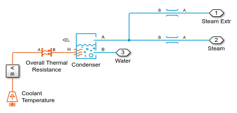 The Saturated Fluid Chamber block and the Turbine block are custom components based on the Simscape™ Foundation Two-Phase Fluid Library. The Saturated Fluid Chamber block models a separate saturated liquid volume and saturated vapor volume and is used to create the boiler and the condenser.